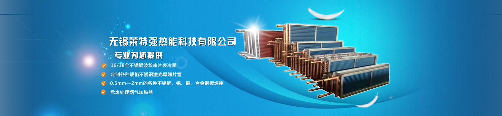 無(wú)錫萊特強(qiáng)熱能科技有限公司是專(zhuān)業(yè)生產(chǎn):銅鋁復(fù)合散熱器、鋼制散熱器、鋼鋁復(fù)合散熱器、(鋼鋁、銅鋁復(fù)合,鋼帶鋼管、不銹鋼、高頻、全銅軋制)等翅片管,空氣熱交換器,熱管換熱器,空氣冷卻器,螺旋板式換熱器,列管換熱器,冷凝器,煙氣加熱器、余熱回收、TSR盤(pán)管的公司。